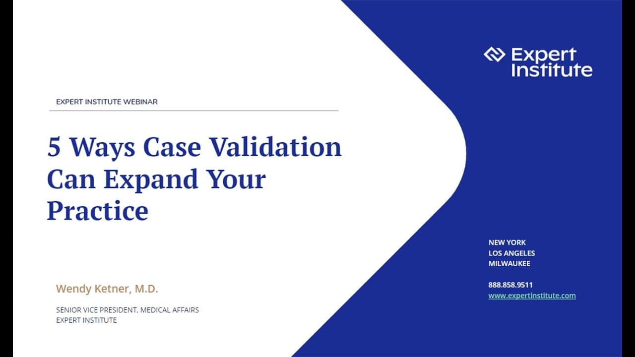 Join General Surgeon, Dr. Wendy Ketner, for a look into how collaborating with expert physicians before signing new matters optimizes your cases, and your firm, for success. Discover how an exploratory consultation with an expert physician can help you separate winning cases from weak cases, give you a competitive edge in the courtroom, and increase your chance of settling cases in favor of your clients.